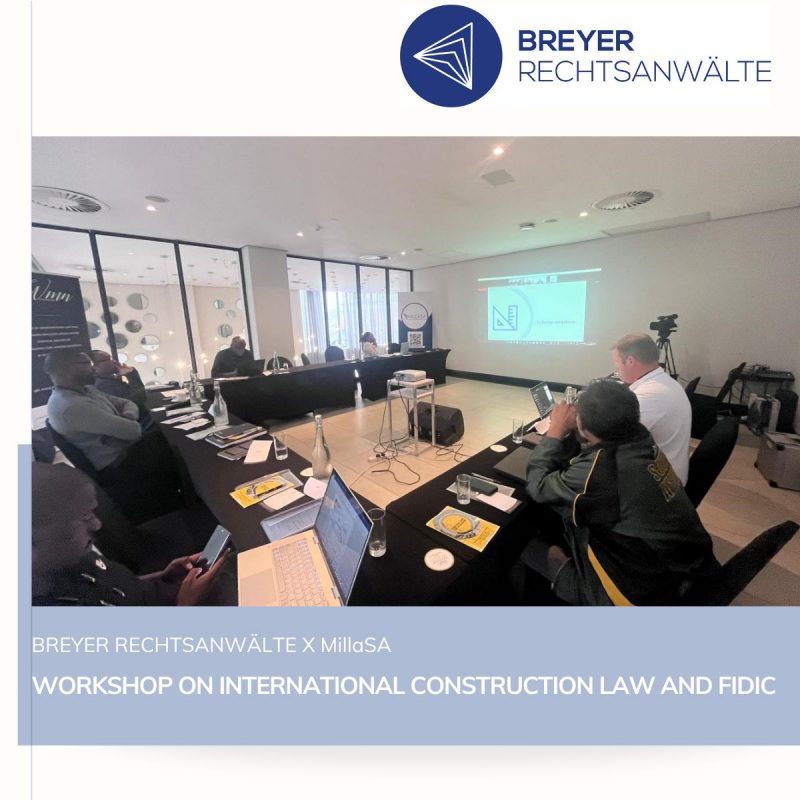 Am 26. September 2024 veranstalteten Wolfgang Breyer und Matthew Jansen gemeinsam einen Workshop zum internationalen Baurecht und zu Standardverträgen (FIDIC) vor Vertretern des privaten und des öffentlichen Sektors in Durban, Südafrika, über eine Entfernung von 3.573 km.